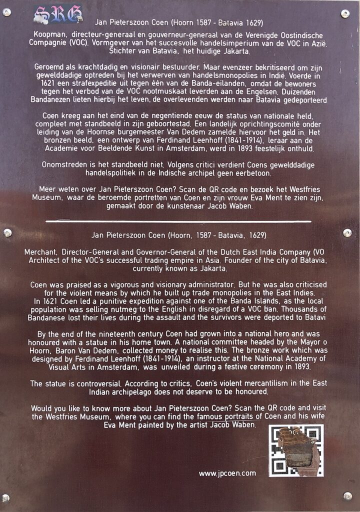 There’s also some educational material on Coen belonging to the museum that can be questioned. For example, in a lesson plan aimed at secondary classes, updated in 2024, the VOC is euphemistically presented as a “business company” and the Banda massacre is barely mentioned. To add to this, it’s stated that the monument “has been there for over 100 years. The statue of Jan Pieterszoon Coen is almost an integral part of the Roode Steen in Hoorn. Yet some would rather see him go, portraying those who support his statue’s removal as a bitter and angry minority, arguably. The museum also has a series of podcasts aimed at providing Hoorn visitors with information about its main monuments. Here, Coen’s wrongdoings are discussed more straightforwardly, but the tone is still light-hearted. What’s even odder is the fact that the tone becomes almost humorous when one of the podcast speakers mentions “Don’t mess with Coen!” after going over the Banda massacre. Here, we can once again see the commodification of the topic that was present in the 2011 trial-exhibition.